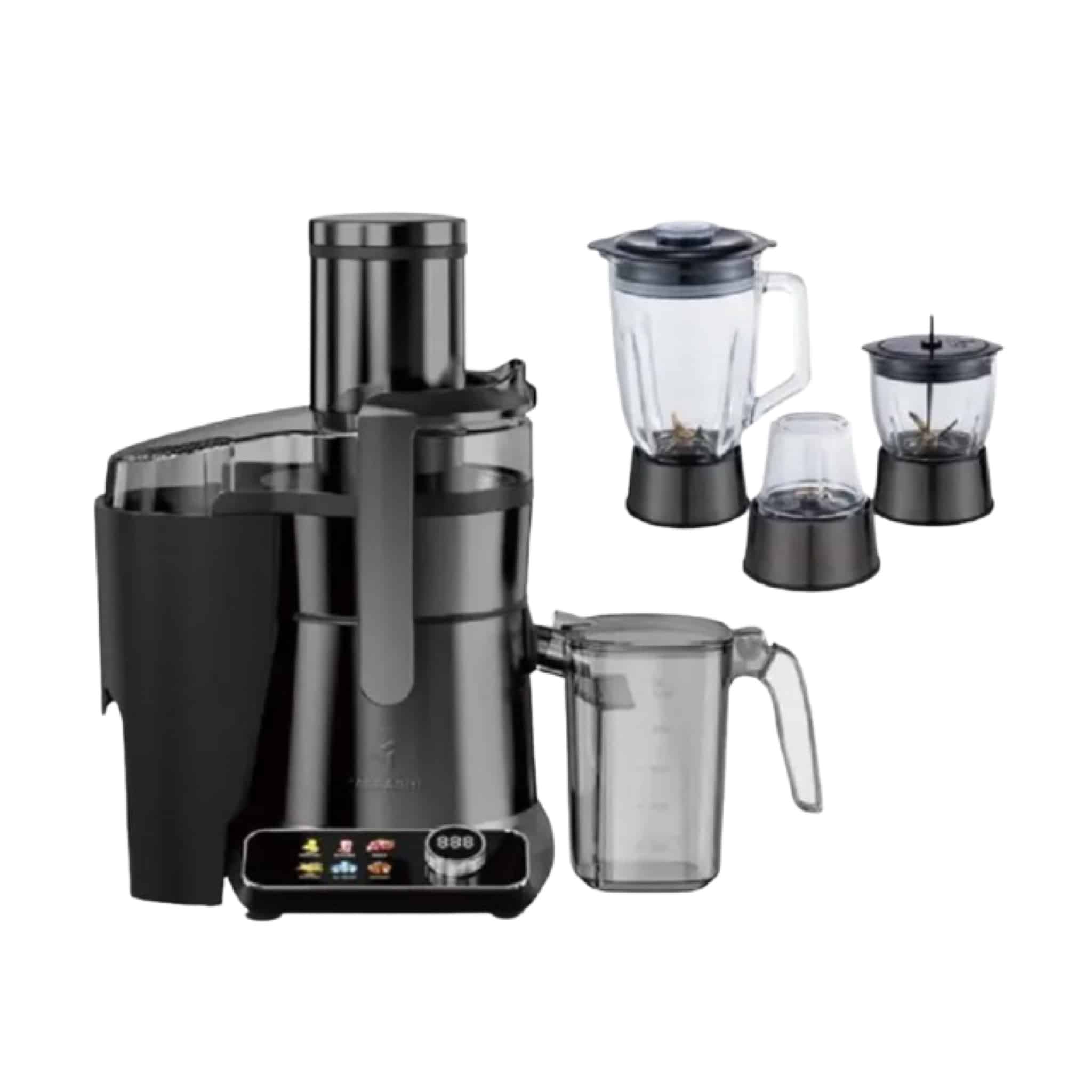 توان موتور: ۱۰۰۰ وات (موتور مسی قدرتمند)------تعداد عملکردها: ۴ کاره – آبمیوهگیری، مخلوطکن، خردکن، آسیاب--------جنس موتور: مسی – با راندمان بالا و عمر طولانی------قطر دهانه ورودی: ۸۵ میلیمتر – مناسب برای ورود میوههای کامل بدون نیاز به خرد کردن------ظرفیت پارچ آبمیوهگیری: ۱.۵ لیتر------تعداد برنامهها: ۶ برنامه هوشمند تنظیم عملکرد